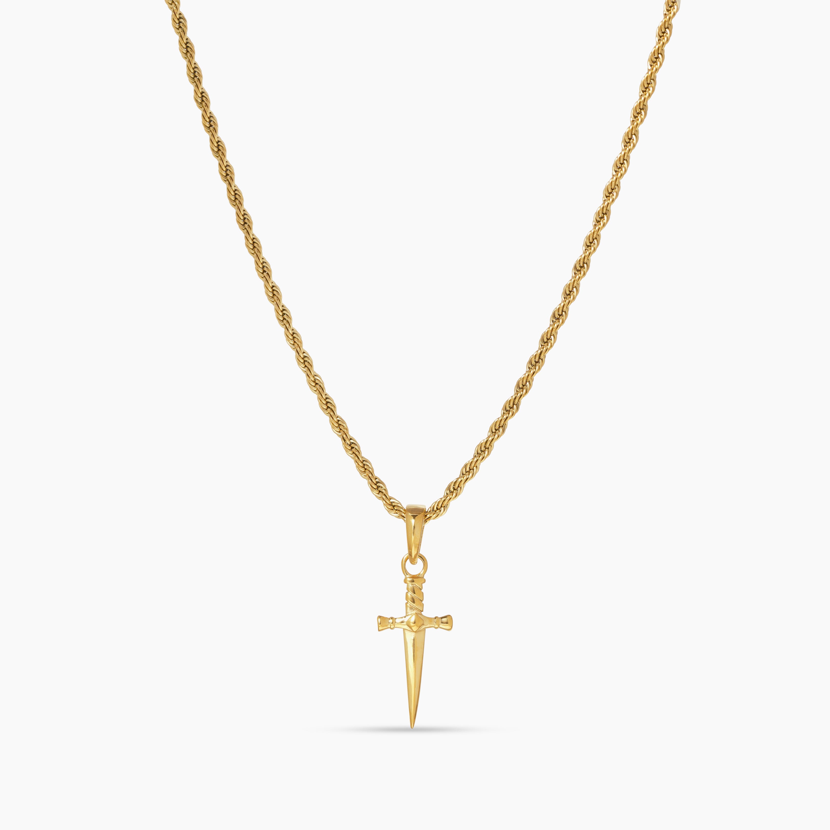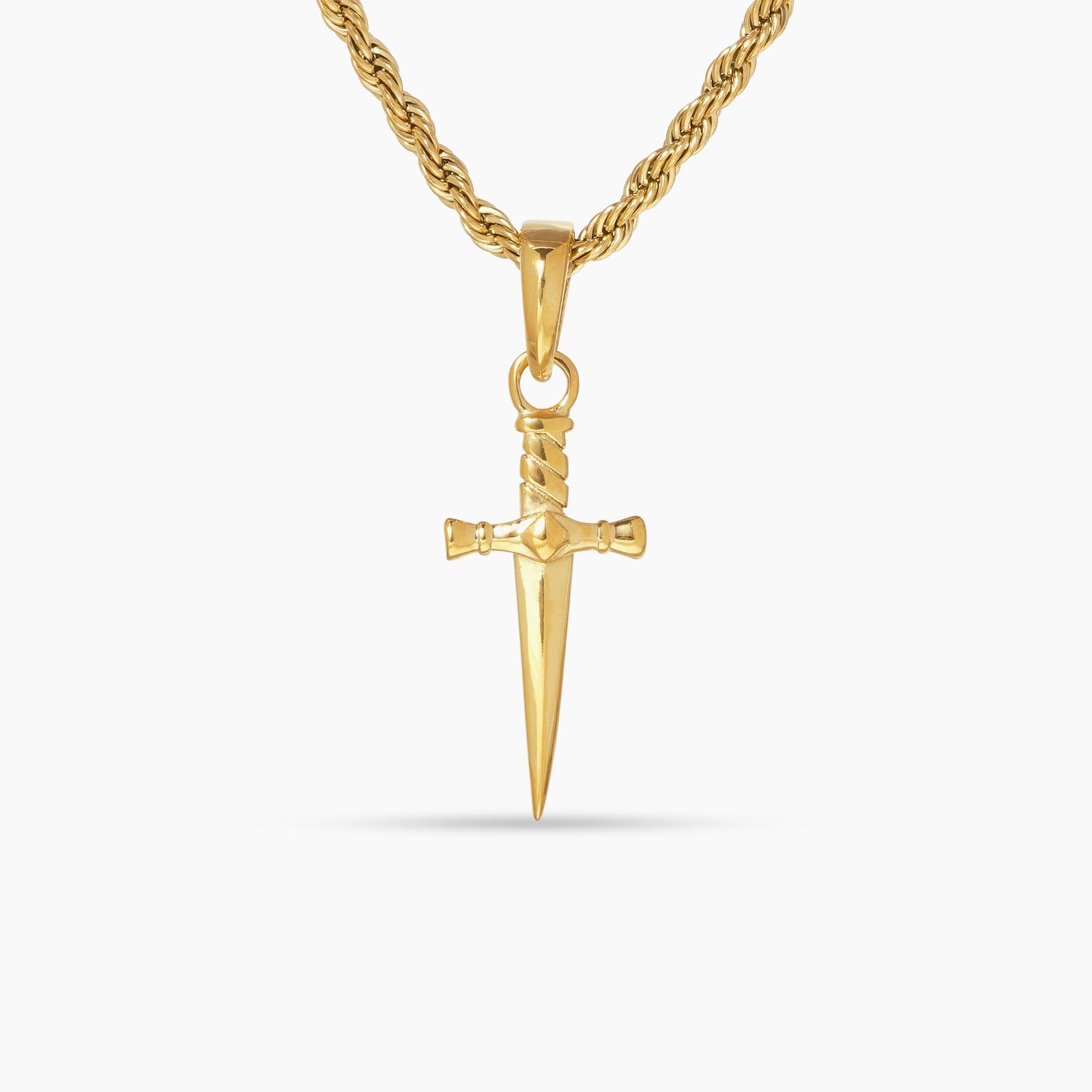 Gold dagger necklace made of high-grade 316L stainless steel and finished off in 18K Gold. Gold Kings creates quality necklaces that guarantee durability through heat, sweat, and water for a lifetime. Pendant & Chain Included.