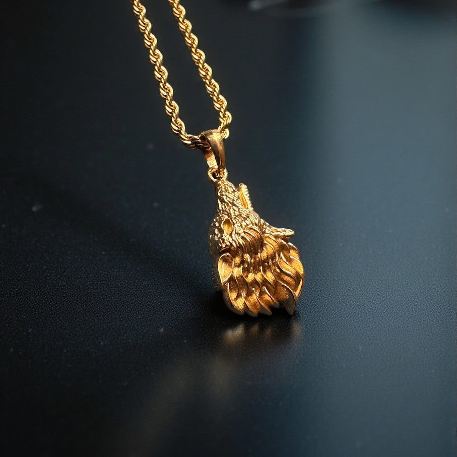 Strikingly detailed and eye-catching wolf plated with 18k Gold. Crafted with 316L stainless steel to guarantee durability through heat, sweat, and water for a lifetime without tarnishing. Pendant & Chain Included.