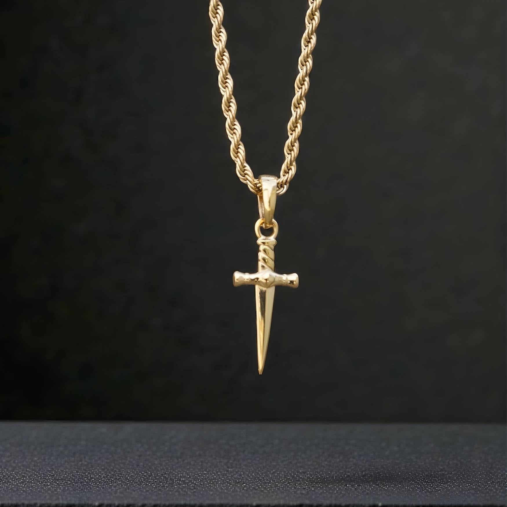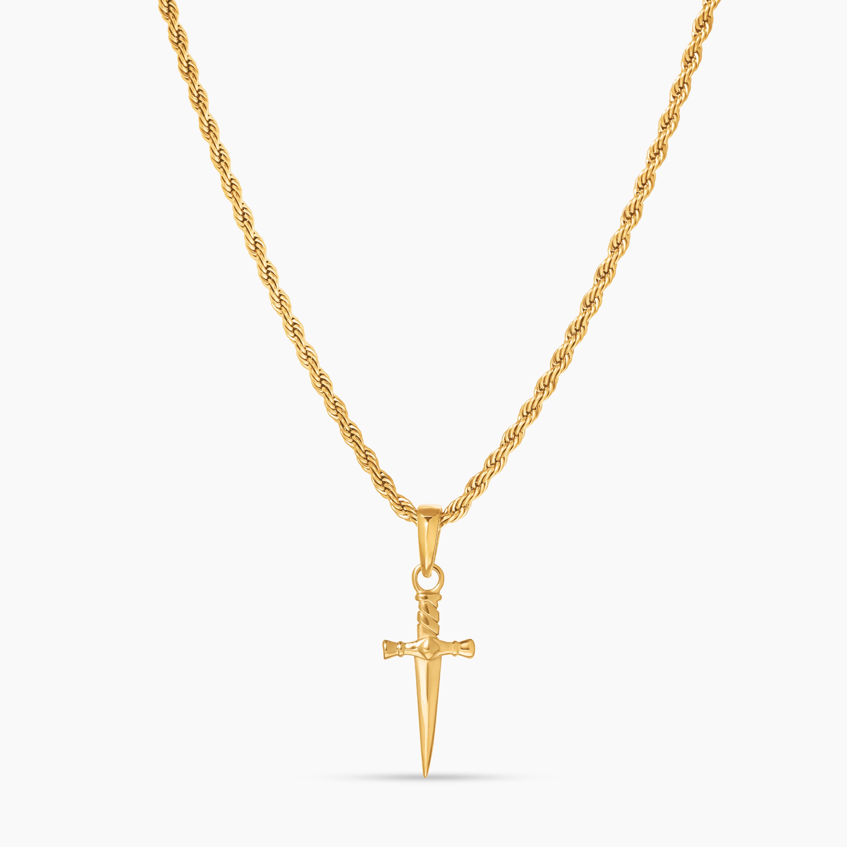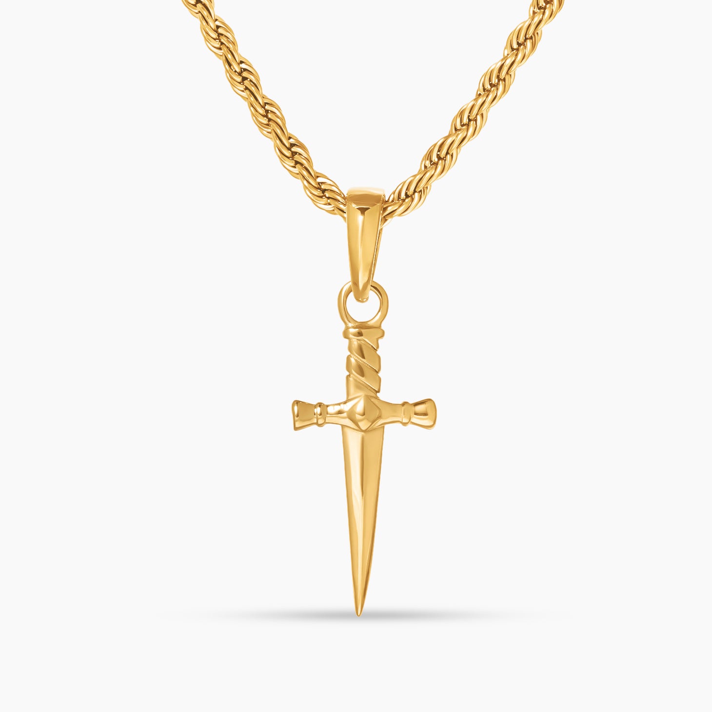 Gold dagger necklace made of high-grade 316L stainless steel and finished off in 18K Gold. Gold Kings creates quality necklaces that guarantee durability through heat, sweat, and water for a lifetime. Pendant & Chain Included.
