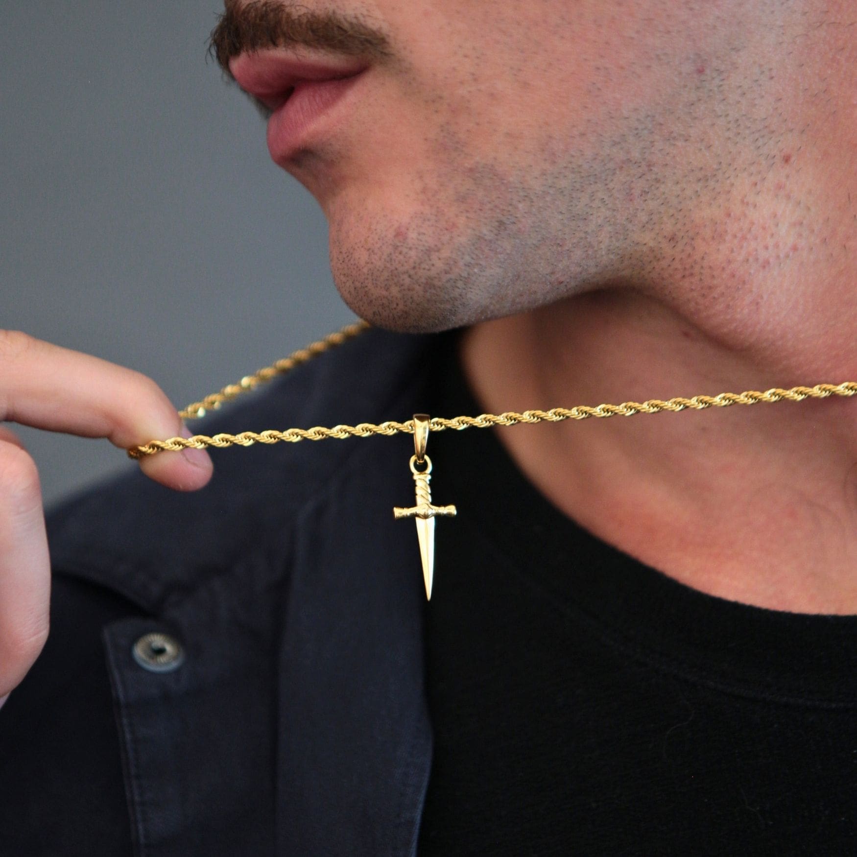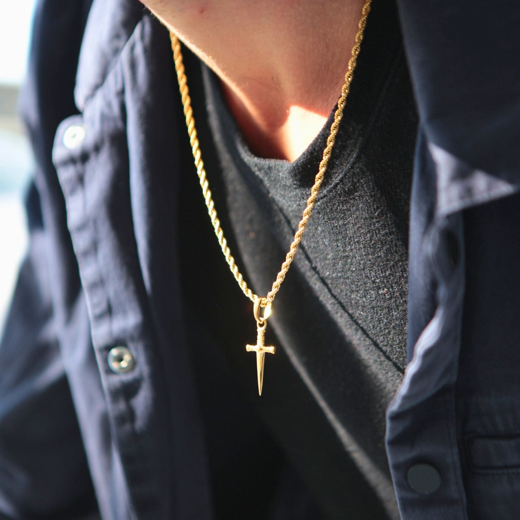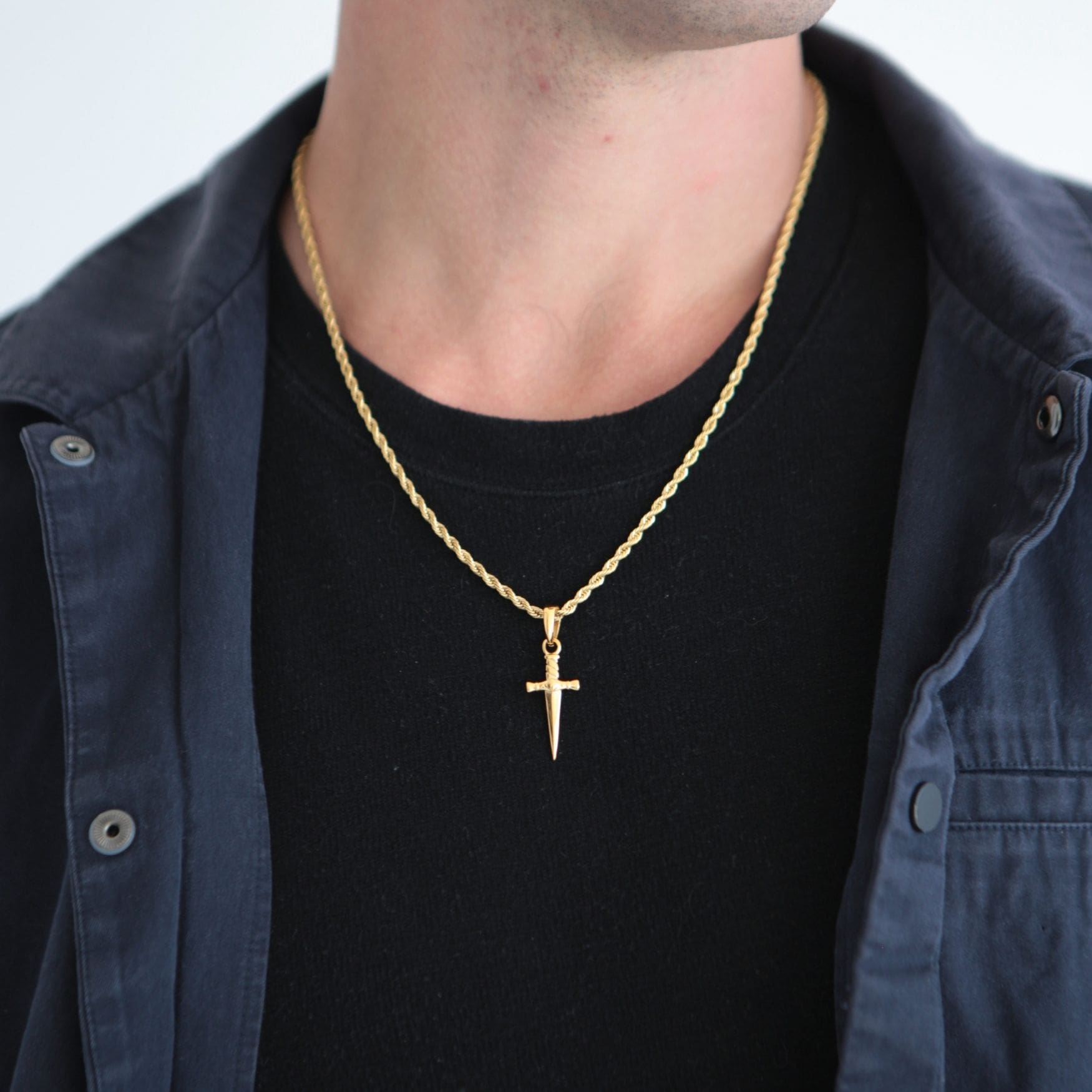 Gold dagger necklace made of high-grade 316L stainless steel and finished off in 18K Gold. Gold Kings creates quality necklaces that guarantee durability through heat, sweat, and water for a lifetime. Pendant & Chain Included.