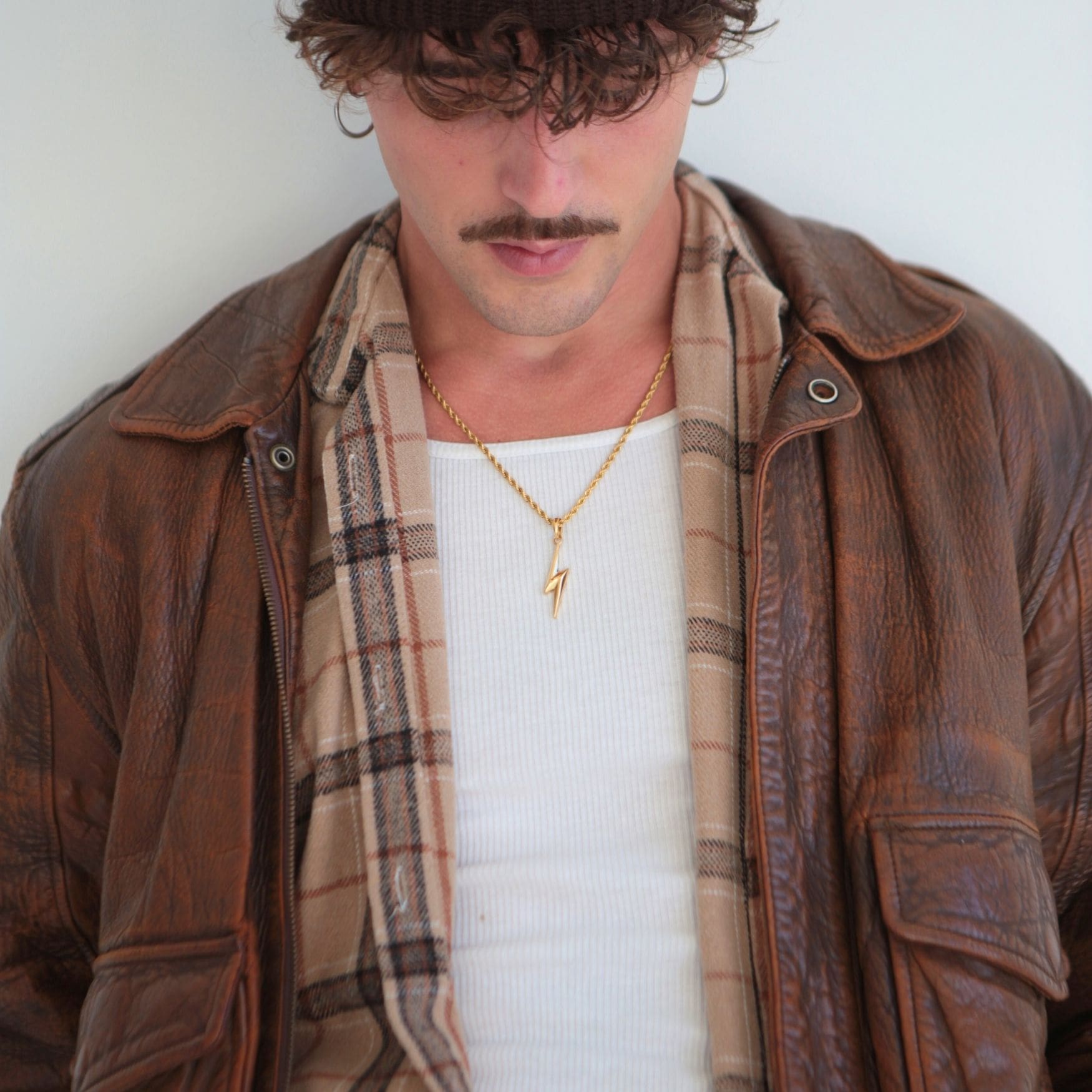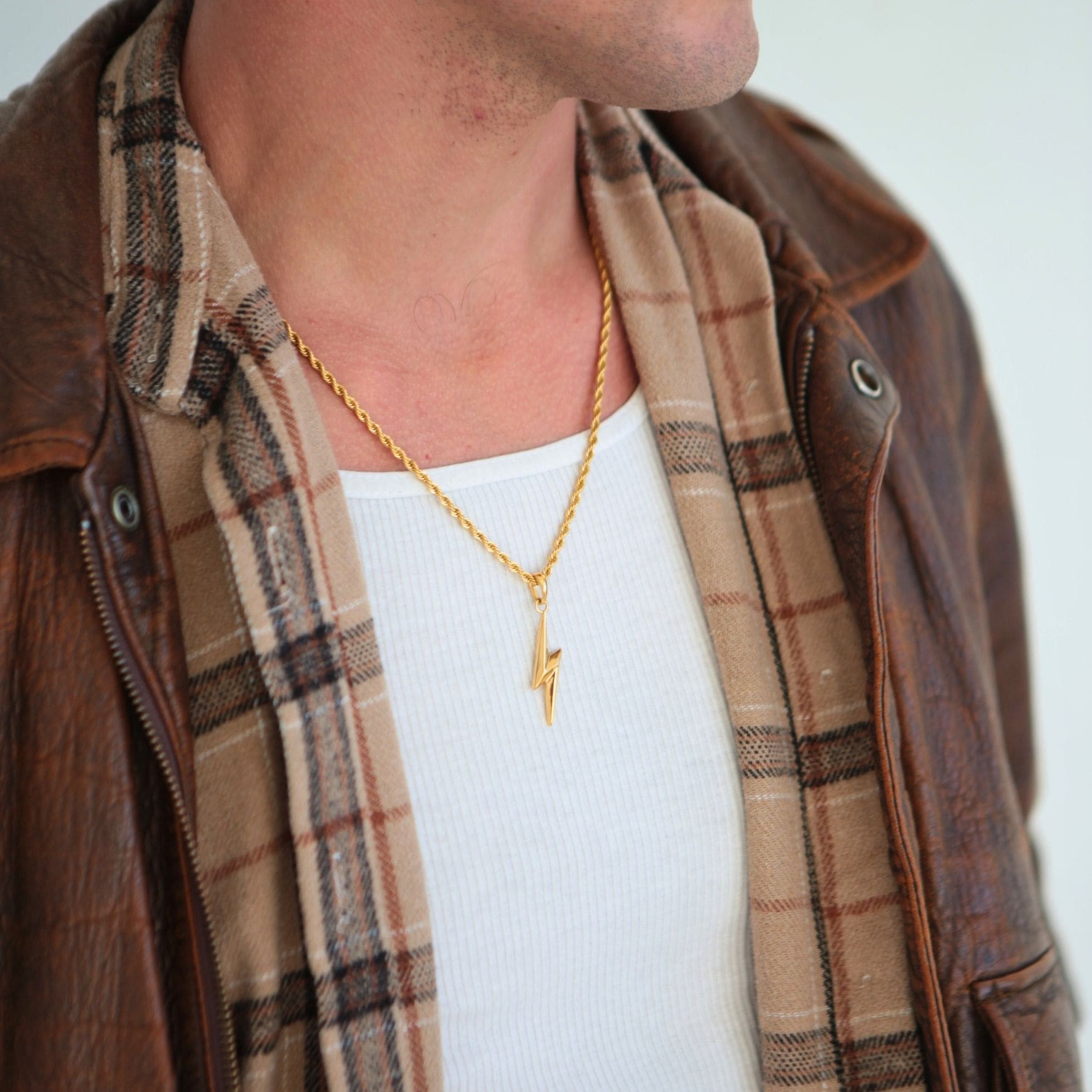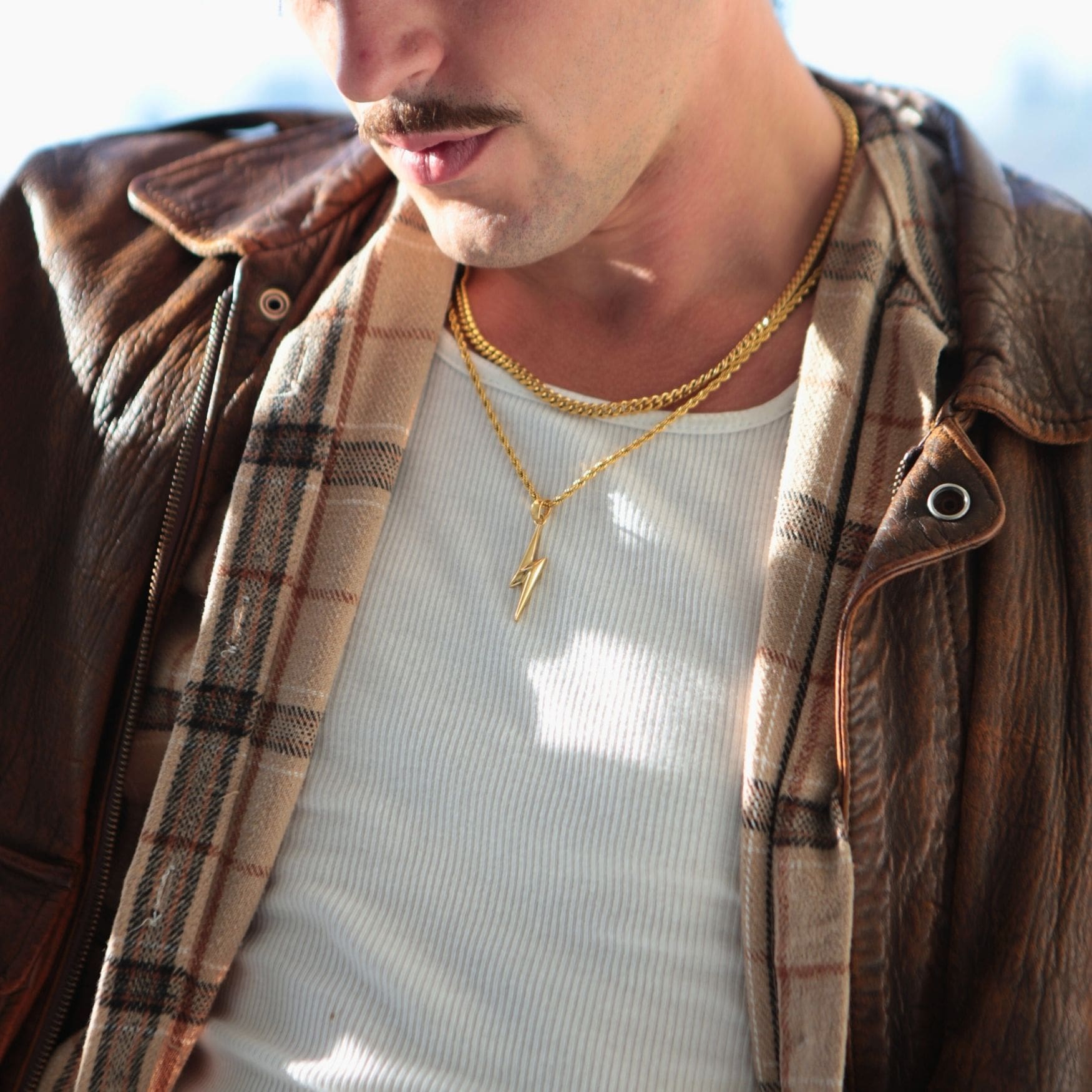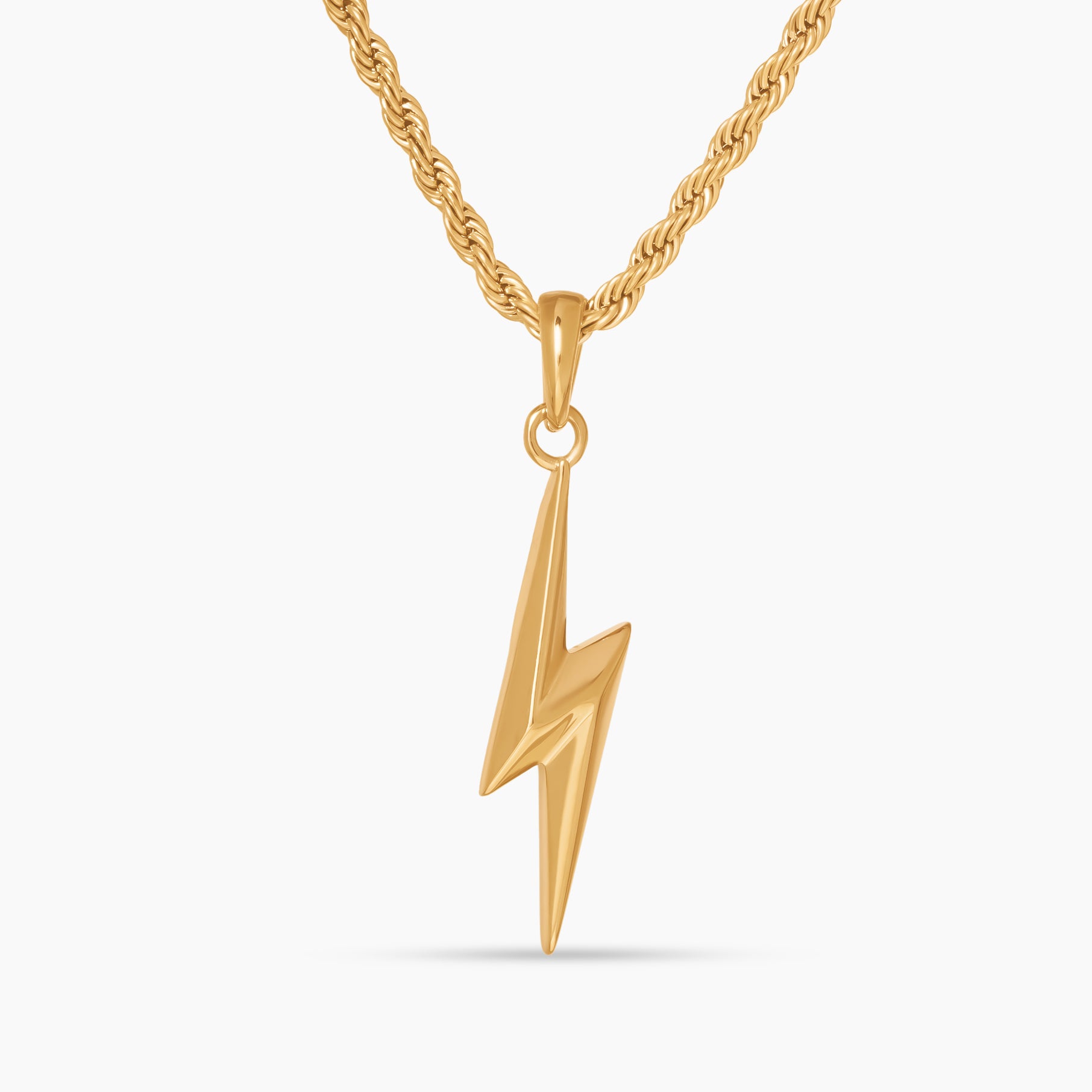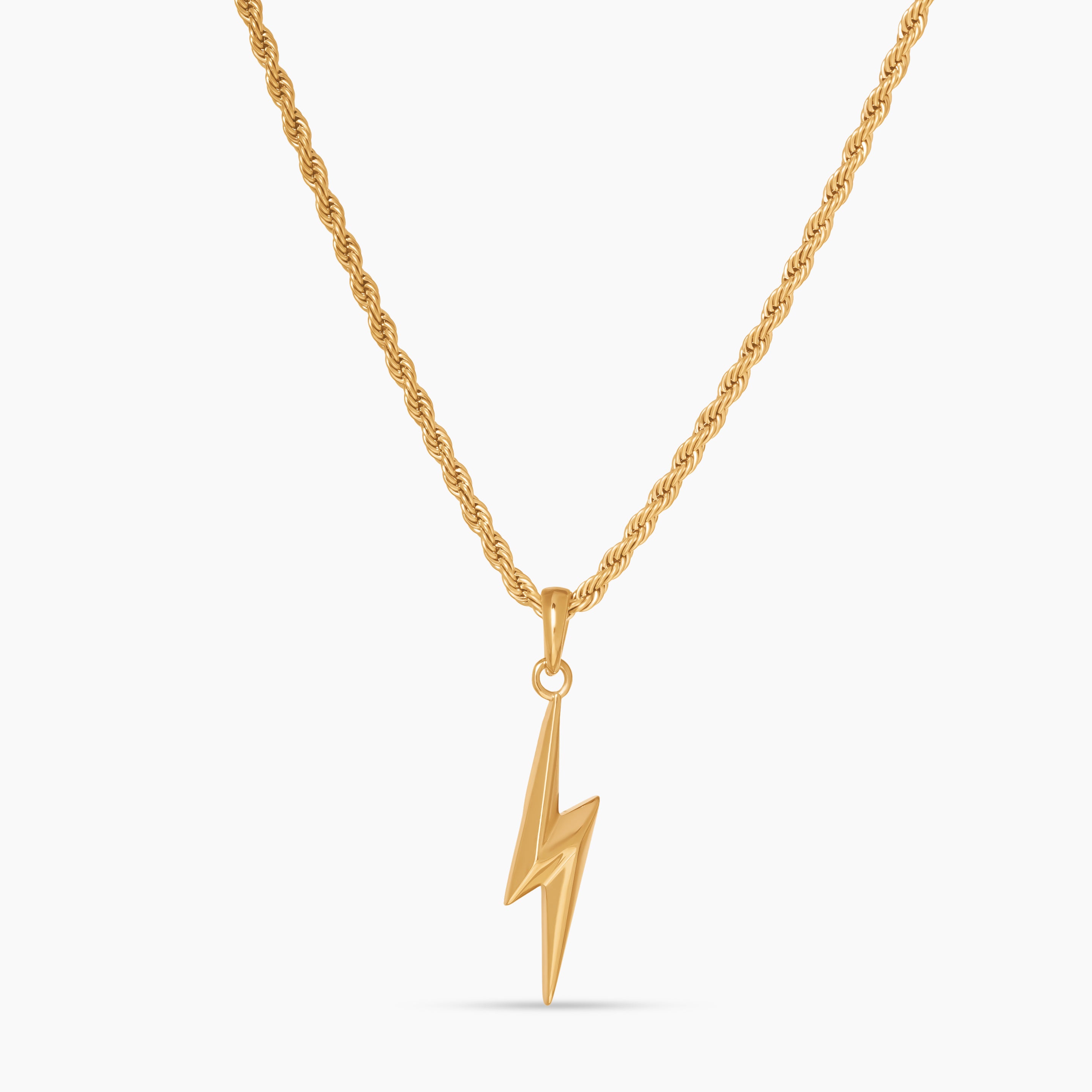 Gold lightning bolt necklace made of high-grade 316L Stainless Steel and finished off in 18K Gold. This necklace is guaranteed to be durable through heat, sweat, and water for a lifetime. Pendant & Chain Included.